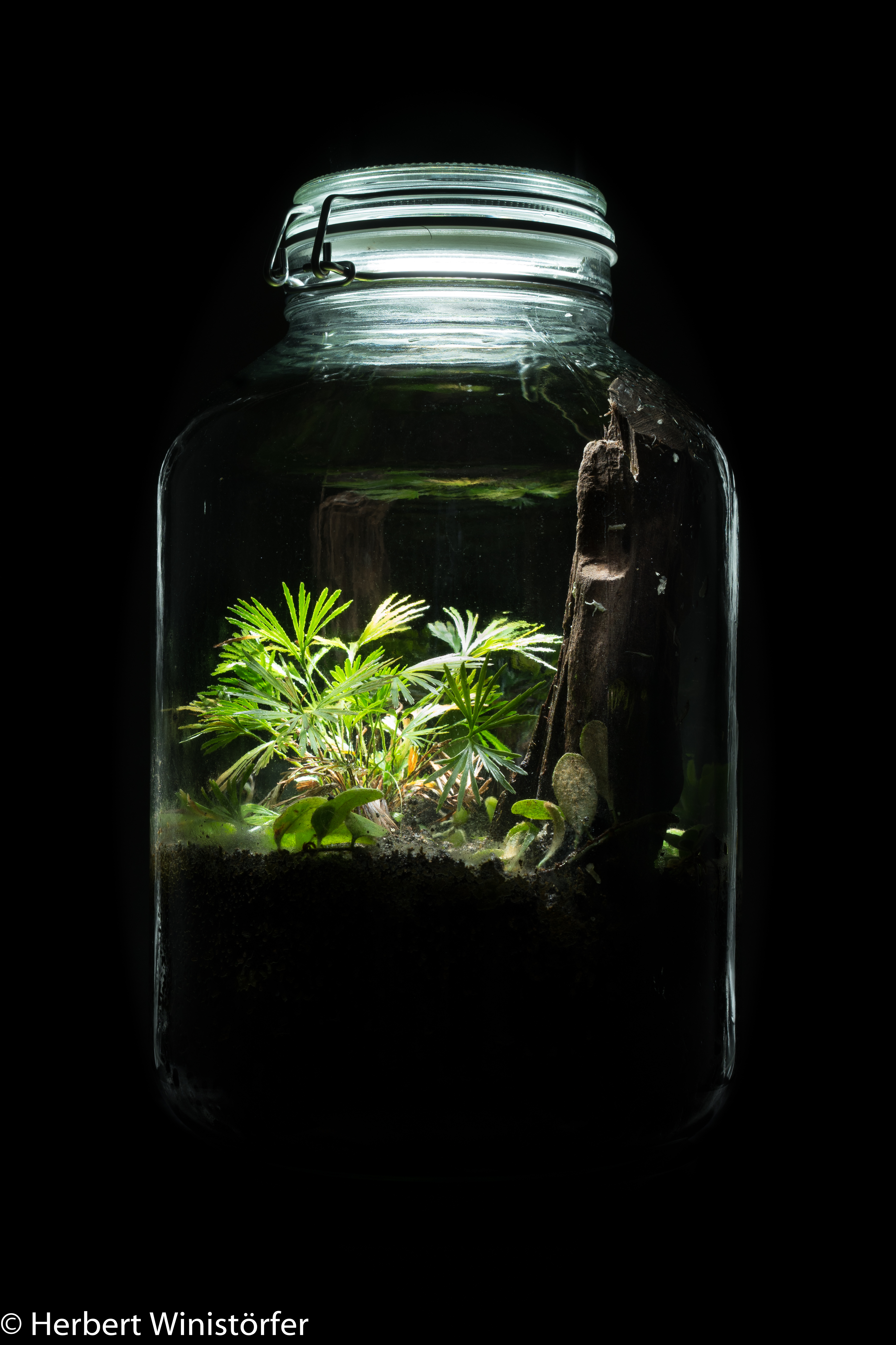 The fern called Peacock’s tail, A. radiata, was meant to be the main protagonist when I started the jar in mid August 2021. Initially, the plant seemed to be comfortable and produced new fronds. After a certain time, older fronds began to develop geyish-white spots. They became yellow, brown and dried out. Today, almost a year after onset, the plant seeme to be dead. However, experience told me not to give up too soon. So I will just leave the jar untouched for now and see what is going to happen next.