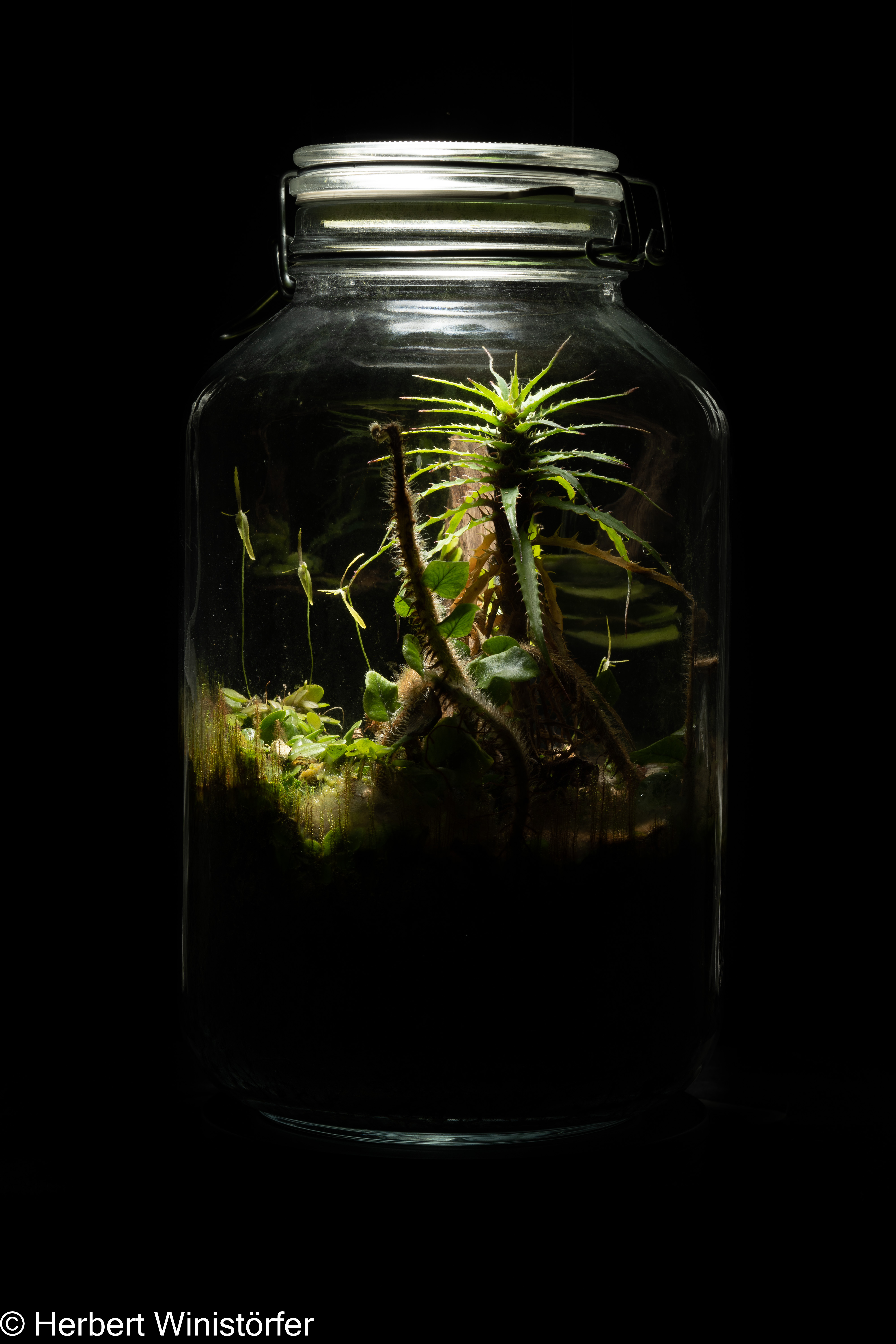It is the first orchid I ever planted in a hermetosphere, and the fragile beauty of its flowers strikes me again every time. Initially it was planted on one side of the substrate with a small portion of its creeping rhizome. It has since worked its way across the entire diameter of the glass to the opposite side. These days, four flowers have developed simultaneously, three on the initial site and one in the newly colonized area: Barbosella cogniauxiana.
