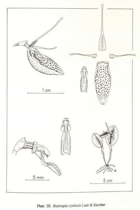 Very little is known about the orchid Restepia cymbula. According to C.A. Luer (1996), who described the species in the Icones Pleurothallidarium, its presumptive discoverer was Mario Portilla, later co-founder of the famous nursery Ecuagenera Cia. Ltda. Luer writes: “This little species without collection data was obtained in 1992 by Colomborquideas Ltd. above Medellin, Colombia, from Mario Portilla in Ecuador. Unfortunately, the only plant known was lost in cultivation in 1996. Restrepia cymbula is easily recognized by the small habit and a small flower with a boat-shaped, red-spotted synsepal.” and choses its name from the Latin cymbula, “a small boat”. Obviously, the plant found its way back into cultivation, but no record could be found of a known natural location.