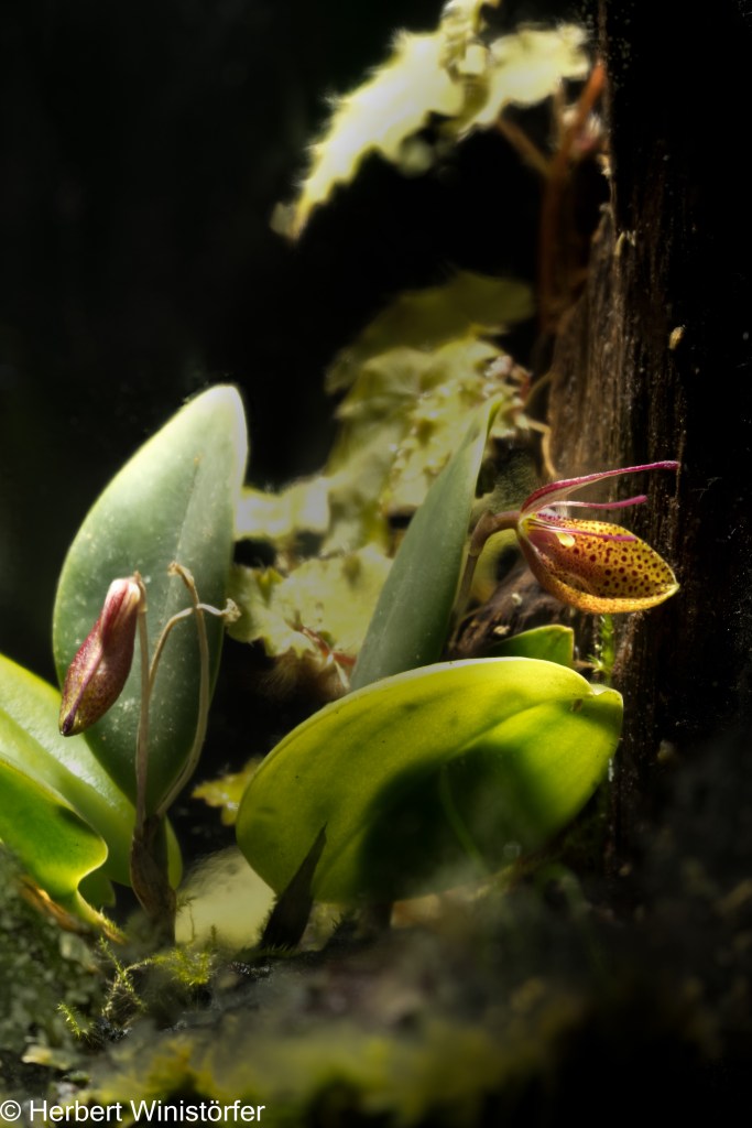 Restrepia cymbula, two flowers open, in a container of 5 litres inspired by the flora of Ecuador; 14.04.2023, 88 days after onset.