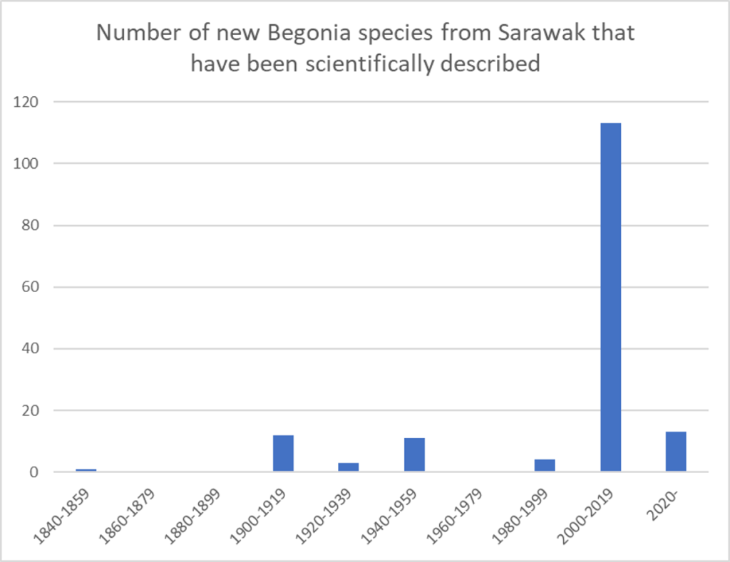 Although the first Begonia from Sarawak has been described more than 150 years ago (Candolle 1859), the vast majority of the 157 species known in 2022 (Sang e.a. 2022) has been published since 2000 (see chart below).
