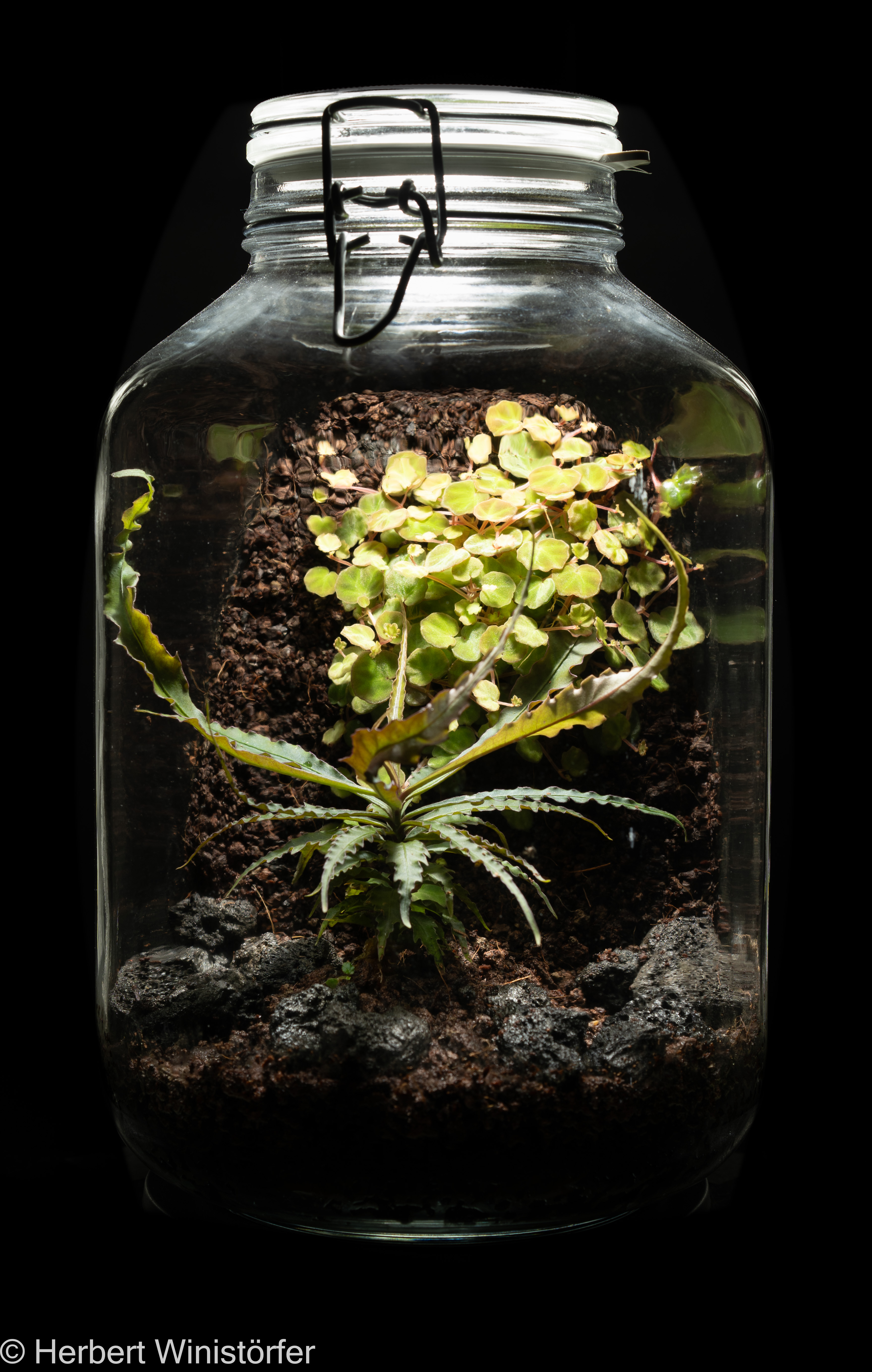 When I came across the plant at my local nursery, saw the small size and discussed the growing conditions, I was pretty confident it could strive in a hermetosphere. So I built a steep slope from lava soil to imitate the plant’s natural habitat and combined it with a Labisia sp. also from Borneo. How well B. lichenora is doing under closed container conditions in the long run will be seen, the start is promising.