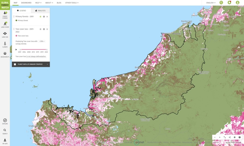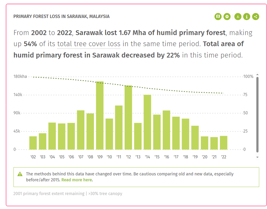 Just like Begonia lichenora, a lot of Begonias are only known from a very limited area: “Despite continuous exploration of forests in Borneo, the percentage of hyperendemic and rare species remains high among Begonia species.” (Sang e.a. 2022, p. 33). Knowing that Sarawak has lost 22% of its humid primary forest from 2002 to 2022 (see chart and map below), it is more than likely we have lost plenty of wonderful species due to deforestation before we are even aware of them. And we continue to do so. Think about it.