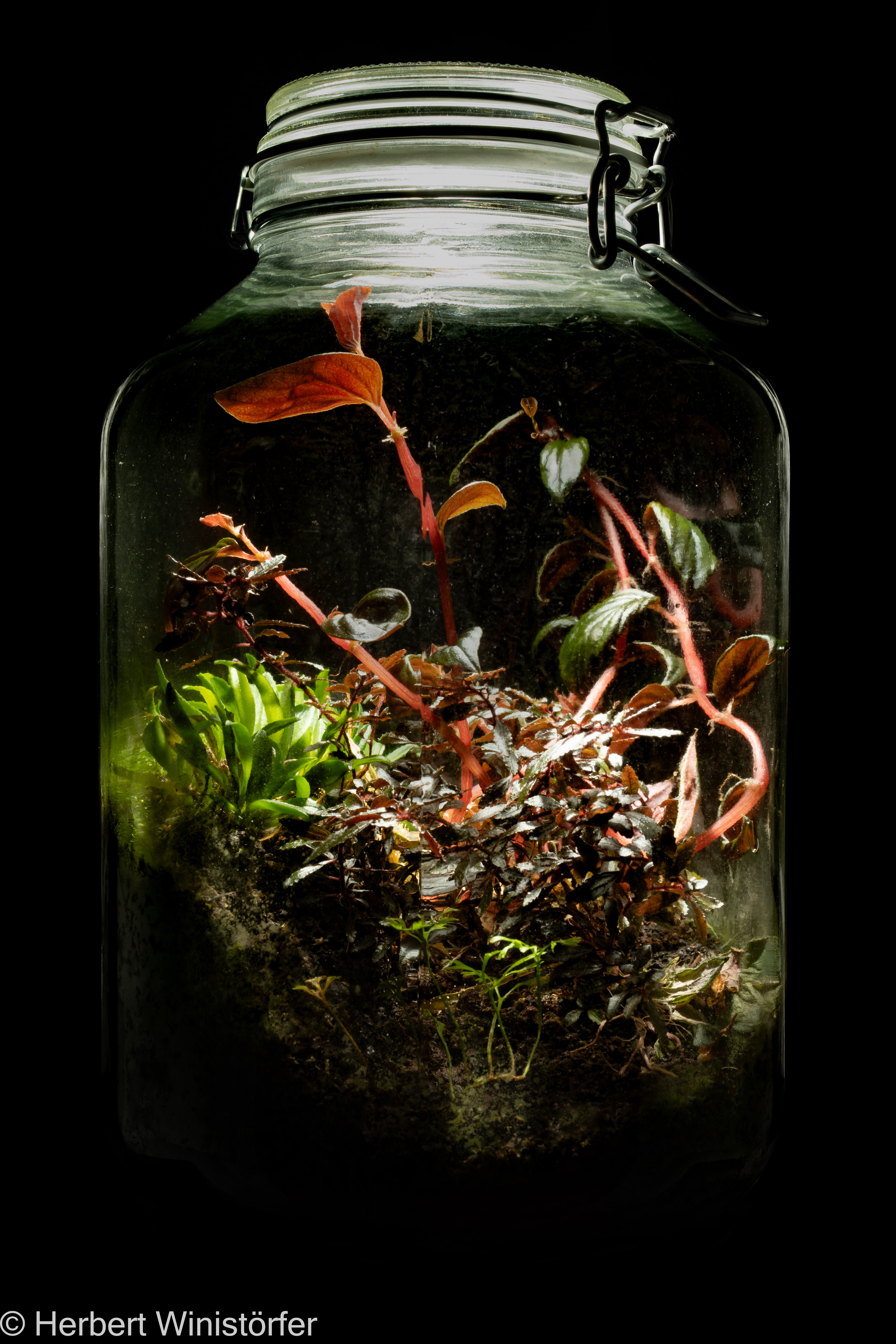 A cultivated plant, that feels exceptionally comfortable in hermetospheres, can serve as example. I would even go so far as to say that if I were to choose just one plant for a container of 5 liters, it would be Triolena pileoides. The plant has the appearance of a miniature shrub with elongated leaves with serrated margins, of dark green colour on top and reddish on the underside. Solitary white flowers occasionally appear at the end of a branch, not much more than 1 cm in diameter, and stay open for just a single day. The characteristic, triangular seed capsules could not be observed in the hermetosphere because pollination of the flowers did not happen.