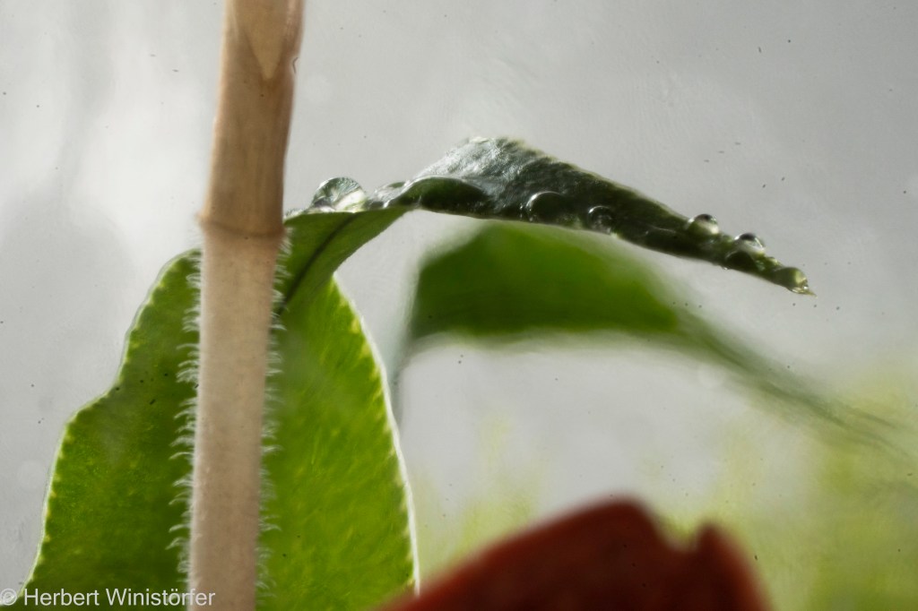 Because guttation could be observed (see the image below) at the leaf margins, it can be assumed that the hydathodes of frond #2 are actually active in the hermetosphere.