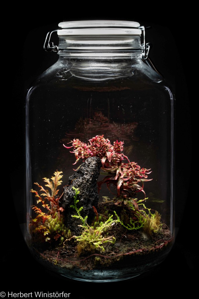 In hermetospheres with limited nutrient supply, S. microphylla is likely to gradually form a loose covering on the substrate without aggressively crowding out larger plants (see the example below).