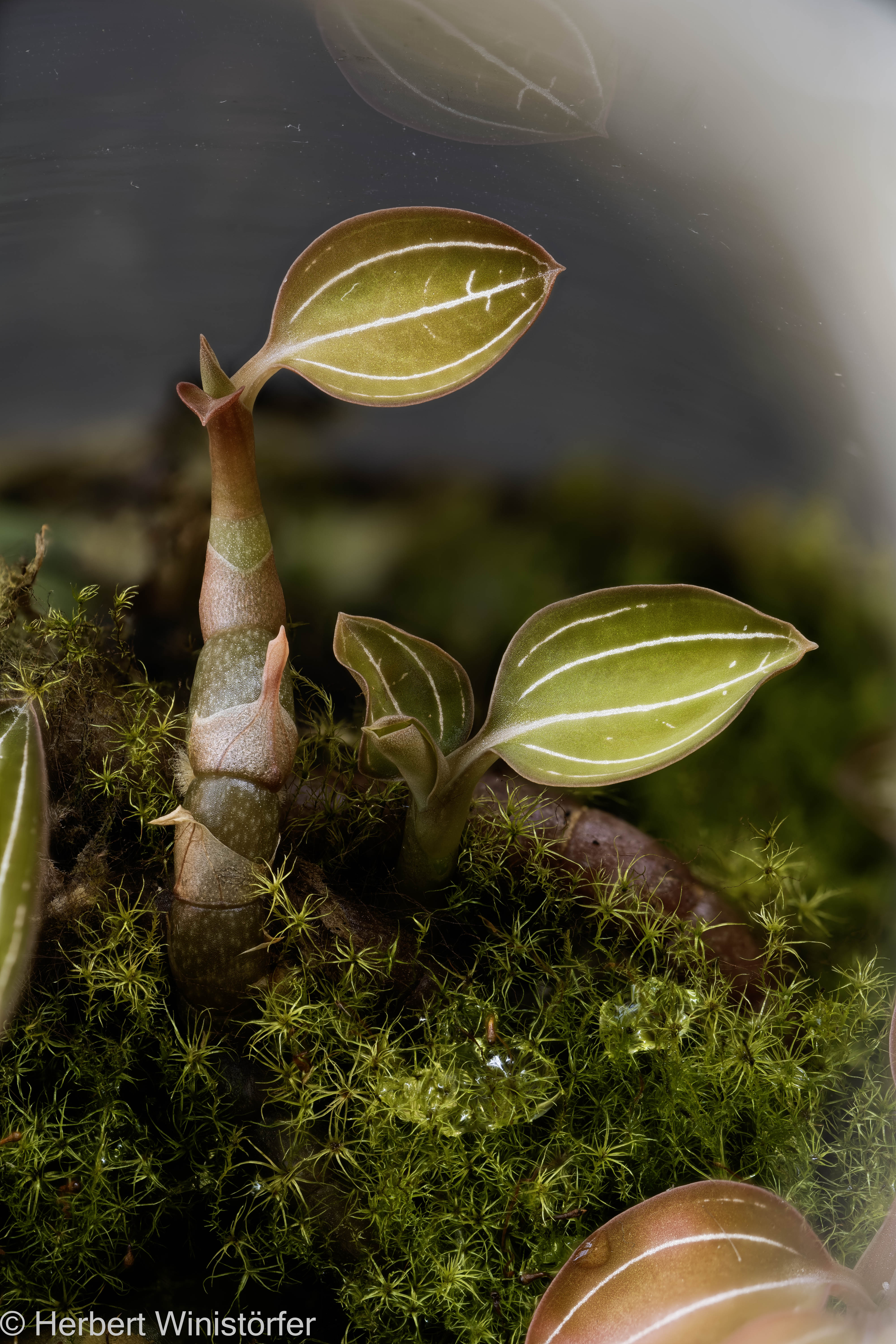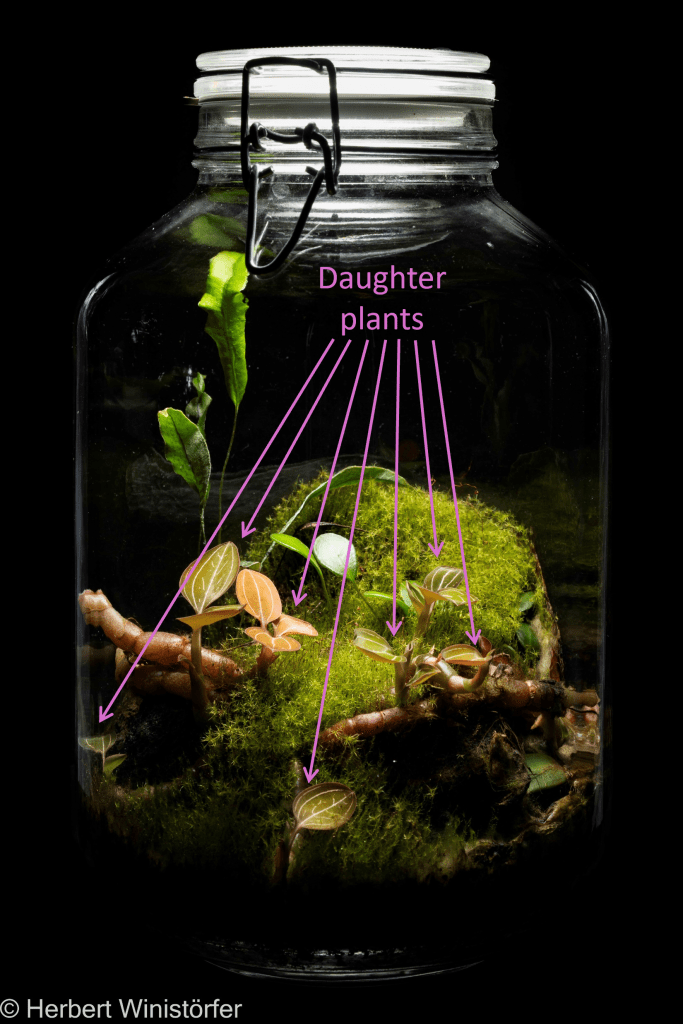 If hermetospheres are supposed to last over years, it is advantageous to work with plants that are able to produce offspring under the particular restrictions given (a.o. limited space, unlikely pollination). I have already been able to observe and describe two different kinds of second generation plants: Production of seed through self-pollination and spontaneous formation of ‘leaf cuttings’. The terrestrial orchid Ludisia discolor has its own way of ensuring offspring in the absence of pollinators. The key to this type of vegetative propagation lies in its rhizome. In botany, this is the name of “a root-like stem, lying horizontally on or situated under the ground, bearing buds or shoots and adventitious roots” (Hickey and King 2000: 36). Their rhizomes belong to the distinguishing features not only of Ludisia but the entire subtribe of Goodyerinae, the group of so-called jewel orchids (Juswara 2010: 17).