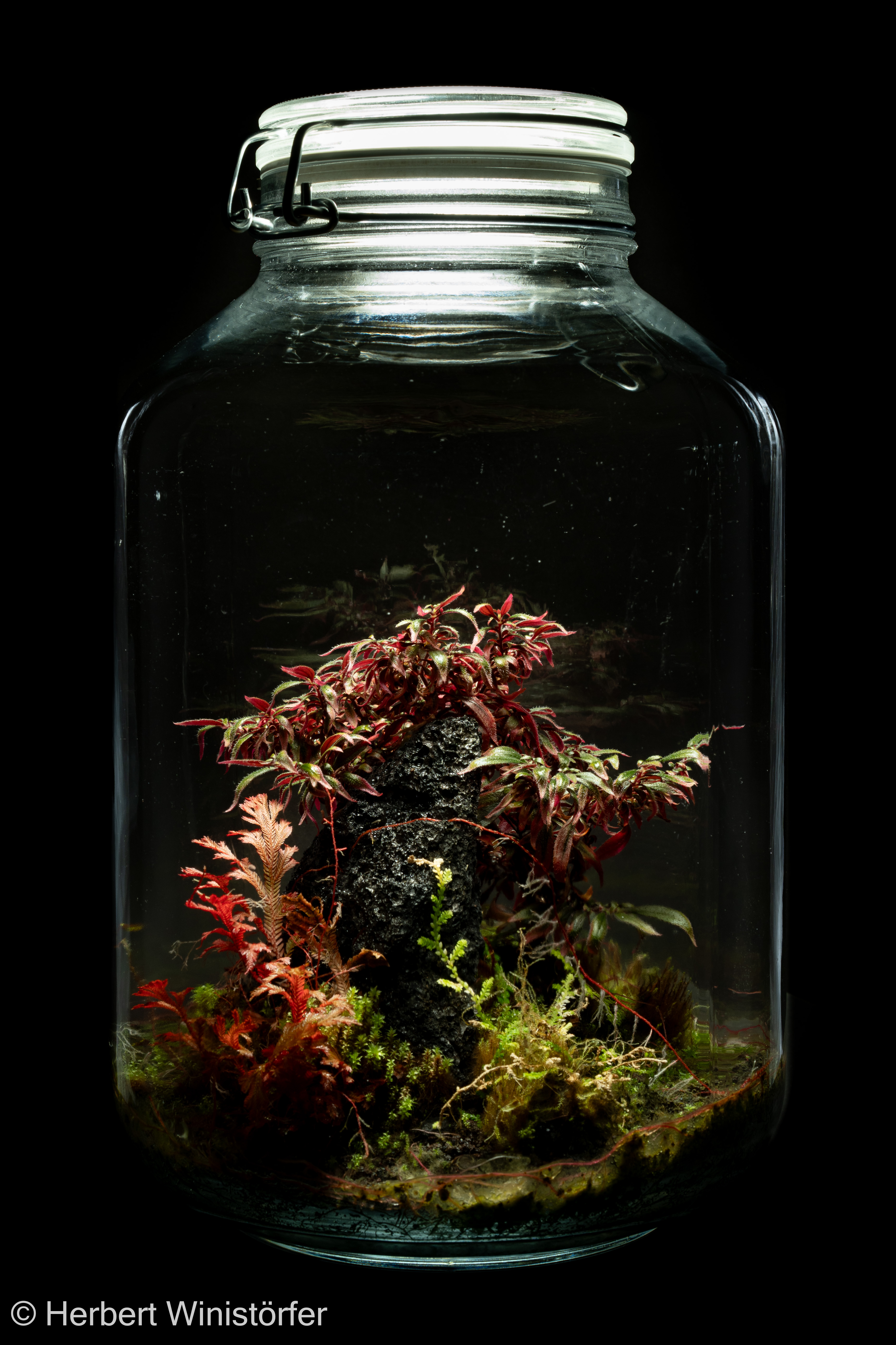 The three images below show a time series from month 1 to month 7 from the start of the development of the plants in a glass, with S. erythropus in the foreground on the left. It can be seen that S. erythropus grew less in the second half (between months 4 and 7) than in the first half (between months 1 and 4). The colour change from green to red on the upper side of the shoots is also clearly visible. In the meantime, I have changed the location of the container and am allowing slightly less light in. Now I am eager to see whether the new shoots will retain their green colour.