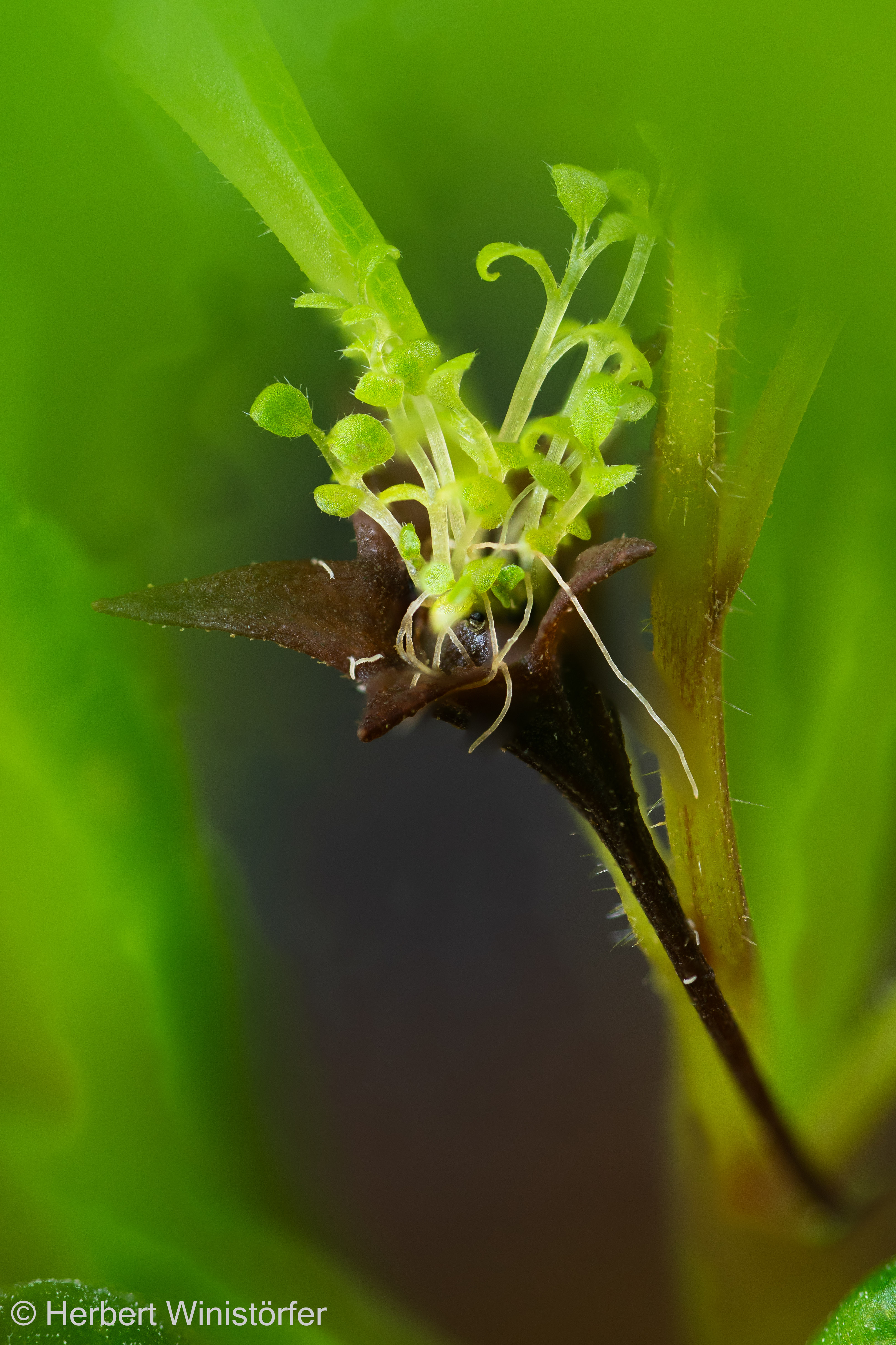 Bacci e.a. (2021) report six herbaceous, neotropical species of Melastomataceae for which cases of vivipary were identified in individuals in the field. After examining the available herbarium specimens of the species in question, they concluded that viviparous germination is a rare occurrence in these species. They assume that “vivipary may be a consequence of an inefficient dispersal syndrome in which the seeds that are not removed from the fruit by raindrops are still in an appropriately moist environment and can then germinate. Whether these seedlings can then establish and propagate themselves is still to be tested.” (Bacci 2021: 81) One of the documented species is Bertolonia mosenii (see figure below).