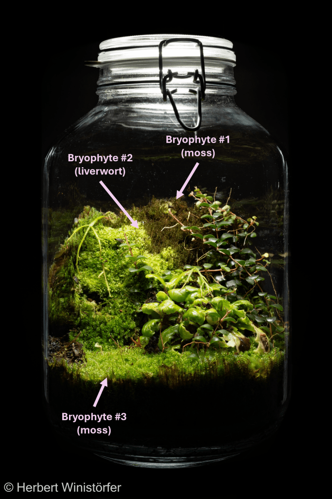 I do not assume that mosses, which I find outdoors in my home country in temperate zones, survive for long in the hermetosphere. Experts on mosses describe the difficulties in cultivating them in terrariums (Glime 2017b: 23) without, however, distinguishing between species from tropical, subtropical or temperate zones.